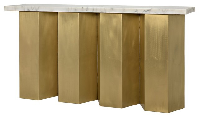 64 Long Console Table Metal Base Antique Brass Finish White Stone Top Modern